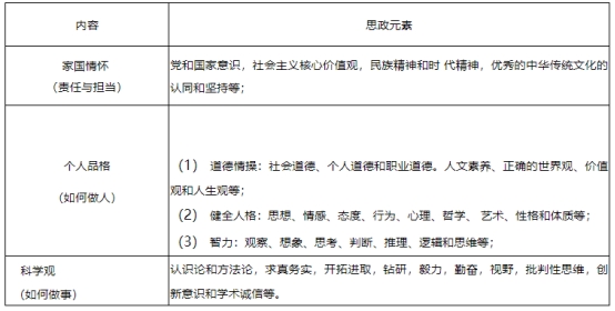 根据课程的特点与建设要求,把实现民族复兴家国情怀与责任担当、做人做事的基本道理、社会主义核心价值观等“思政元素”融入课程教学,进一步突显 课程“育德”功能。主要包括: