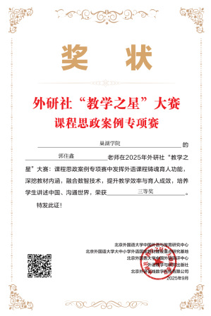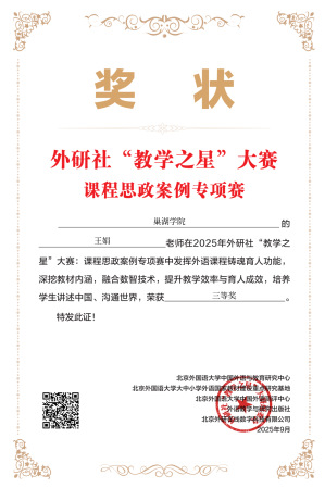 近日,2025 年外研社 “教学之星” 大赛课程思政案例专项赛评选结果揭晓,必赢76net官网外国语学院教师凭借卓越教学设计与创新思政教育理念,在激烈竞争中脱颖而出,斩获佳绩。王友情获全国一等奖,王钢、王娟(小)、郭佳鑫分获全国三等奖。